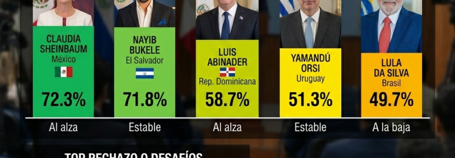 En la franja media del espectro, mandatarios como Luis Abinader (República Dominicana) con un 58.7% y Yamandú Orsi (Uruguay) con el 51.3%, representan una estabilidad democrática que parece resistir los embates del descontento regional. Sin embargo, no todo es crecimiento; la volatilidad es la norma. Líderes como Javier Milei (Argentina) han experimentado caídas significativas debido al impacto acumulado de ajustes económicos, situándose en torno al 46%, lo que evidencia cómo el “periodo de gracia” de los nuevos gobiernos es cada vez más breve en el contexto latinoamericano actual.