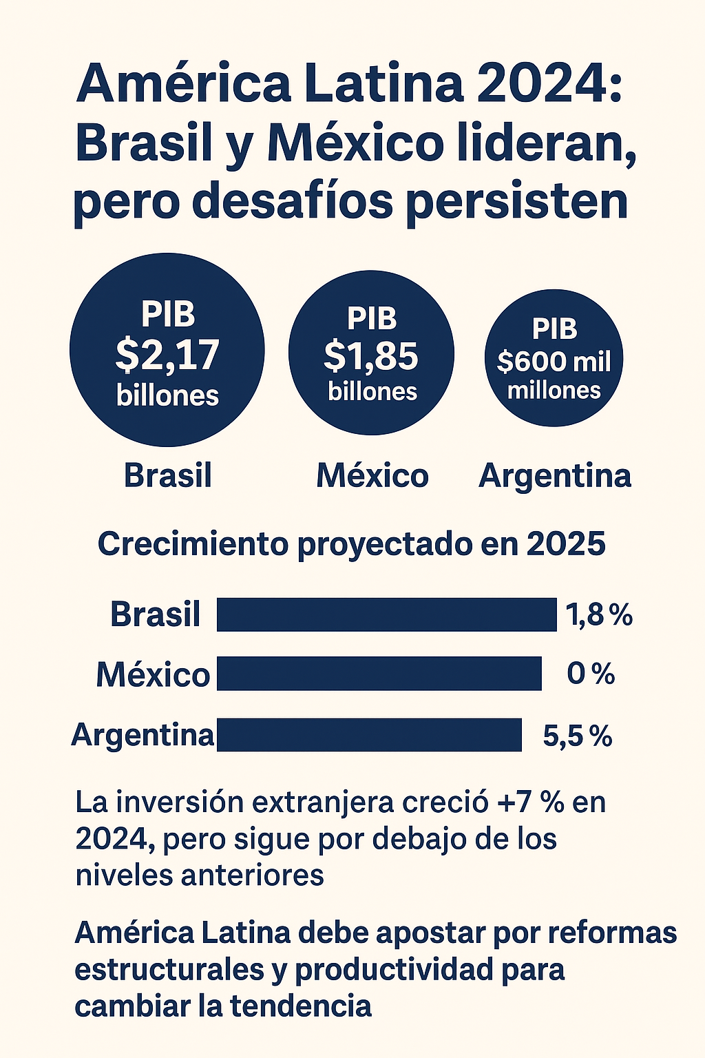 En 2024, Brasil y México reafirmaron su papel como las principales potencias económicas de América Latina y el Caribe en términos de PIB nominal. Con cifras cercanas a los 2,17 billones de USD, Brasil mantuvo su posición de liderazgo; mientras que México se ubicó como segunda economía regional con aproximadamente…